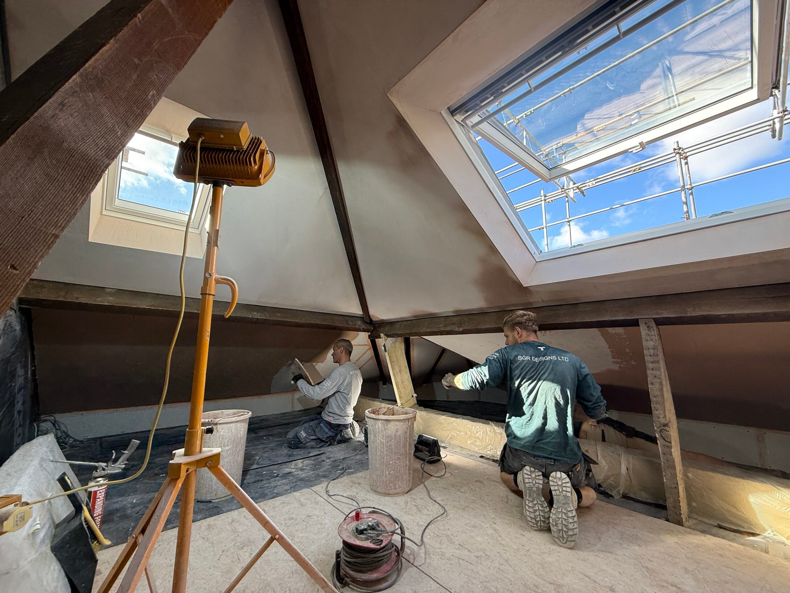 At BGR, we tackled the project in stages. First, we reinforced the structure – removing old insulation and roof coverings, then carefully installing steels, timbers, and brackets to maintain stability. Next, we maximised efficiency with high-performance insulation and airtight detailing. Finally, we introduced the design elements that make the space shine: rooflights for daylight, exposed character features, and clean modern finishes.